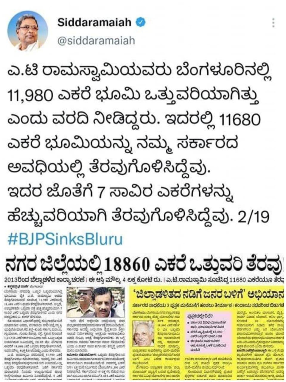 2006ರಲ್ಲಿ ಕುಮಾರಸ್ವಾಮಿ ಮೊದಲ ಸಲ ಸಿಎಂ ಆಗಿದ್ದಾಗ ಬೆಂಗಳೂರಿನಾದ್ಯಂತ ಭೂಗಳ್ಳರು ಒತ್ತುವರಿ ಮಾಡಿಕೊಂಡಿರೋ ಭೂಮಿಯ ಸಂಪೂರ್ಣ ವರದಿ ನೀಡುವಂತೆ ಎ.ಟಿ ರಾಮಸ್ವಾಮಿ ನೇತೃತ್ವದ ಸದನ ಸಮಿತಿ ರಚಿಸಿದ್ದರು.. ಆ ವರದಿಯಲ್ಲಿ 11,000 ಎಕರೆ ಭೂಮಿ ಒತ್ತುವರಿ ಆಗಿದೆ ಅನ್ನೋದು ವರದಿಯಲ್ಲಿತ್ತು.. ರಾಮಸ್ವಾಮಿಯವರು ನೀಡಿದ್ದ ವರದಿ ಧೂಳು ಹಿಡಿದು ಕೂತಿತ್ತು.. 2013ರಲ್ಲಿ ಸಿದ್ದರಾಮಯ್ಯ ಮುಖ್ಯಮಂತ್ರಿಯಾಗಿ ಪ್ರಮಾಣ ವಚನ ಸ್ವೀಕರಿಸಿದ ಮೇಲೆ ಮೊದಲ ಸಲ ಪ್ರಗತಿಪರರ ಭೇಟಿಗೆ ಮುಂದಾದ್ರು.. 2014ರಲ್ಲಿ ಸ್ವಾತಂತ್ರ್ಯ ಹೋರಾಟಗಾರ ಎಚ್.ಎಸ್ ದೊರೈಸ್ವಾಮಿ ಸಿದ್ದರಾಮಯ್ಯ ಅವರಿಗೆ ಒಂದು ಮನವಿ ಮಾಡಿದ್ರು.. ಭೂಗಳ್ಳರಿಂದ ಸರ್ಕಾರಿ ಭೂಮಿ ತೆರವುಗೊಳಿಸುವುದಕ್ಕೆ ದಕ್ಷ ಜಿಲ್ಲಾಧಿಕಾರಿ ನೇಮಕ ಮಾಡುವಂತೆ ಕೋರಿದ್ರು..