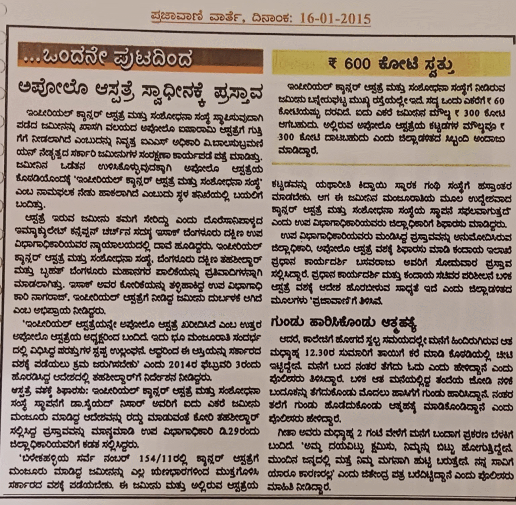 ಇಂಪೀರಿಯಲ್ ಕ್ಯಾನ್ಸರ್ ಆಸ್ಪತ್ರೆ ಮತ್ತು ಸಂಶೋಧನಾ ಸಂಸ್ಥೆ ಸ್ಥಾಪಿಸುವುದಾಗಿ ನಡೆದ ಜಮೀನನ್ನು ಖಾಸಗಿ ವಲಯದ ಅಪೋಬೊ ಐಷಾರಾಮಿ ಆಸ್ಪತ್ರೆಗೆ ಗುತ್ತಿ ಗೆಗೆ ನೀಡಲಾಗಿದೆ ಎಂಬುದನ್ನು ನಿವೃತ್ತ ಎಎಸ್ ಅಧಿಕಾರಿ ವಿ.ಬಾಲಸುಬ್ರಮಣಿ ಯನ್ ನೇತೃತ್ವದ ಸರ್ಕಾರಿ ಜಮೀನುಗಳ ಸಂರಕ್ಷಣಾ ಕಾರ್ಯವಡೆ ಪತ್ತೆ ಮಾಡಿತ್ತು. ಜಮೀನಿನ ಒಡೆತನ ಉಳಿಸಿಕೊಳ್ಳುವುದಕ್ಕಾಗಿ ಅಪೋಲೊ ಆಸ್ಪತ್ರೆಯ ಕೊಠಡಿಯೊಂದಕ್ಕೆ ‘ಇಂಪೀರಿಯಲ್ ಕ್ಯಾನ್ಸರ್ ಆಸ್ಪತ್ರೆ ಮತ್ತು ಸಂಶೋಧನಾ ಸಂಸ್ಥೆ’ ಎಂಬ ನಾಮಫಲಕ ನೆಡು ಹಾಕಲಾಗಿದೆ ಎಂಬುದು ಸ್ಥಳ ತನಿಖೆಯಲ್ಲಿ ಬಯಲಿಗೆ ಬಂದಿತ್ತು