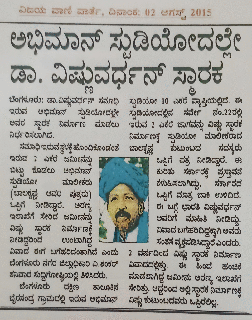 ಸಮಾಧಿ ಇರುವ ಸ್ಥಳಕ್ಕೆ ಹೊಂದಿಕೊಂಡಂತೆ ಇರುವ 2 ಎಕರೆ ಜಮೀನನ್ನು ಬಿಟ್ಟು ಕೊಡಲು ಅಭಿಮಾನ್ ಸ್ಟುಡಿಯೋ ಮಾಲೀಕರು (ಬಾಲಕೃಷ್ಣ ಅವರ ಪುತ್ರರು) ಒಪ್ಪಿಗೆ ನೀಡಿದ್ದಾರೆ. ಅರಣ್ಯ ಇಲಾಖೆಗೆ ಸೇರಿದ ಜಮೀನನ್ನು ವಿಷ್ಣು ಸ್ಮಾರಕ ನಿರ್ಮಾಣಕ್ಕೆ ನೀಡಿದ್ದರಿಂದ ಉಂಟಾಗಿದ್ದ ವಿವಾದ ಈಗ ಬಗೆಹರಿದಂತಾಗಿದೆ ಎಂದು ಬೆಂಗಳೂರು ನಗರ ಜಿಲ್ಲಾಧಿಕಾರಿ ವಿ.ಶಂಕರ್ ಶನಿವಾರ ಸುದ್ದಿಗೋಷ್ಠಿಯಲ್ಲಿ ತಿಳಿಸಿದರು.