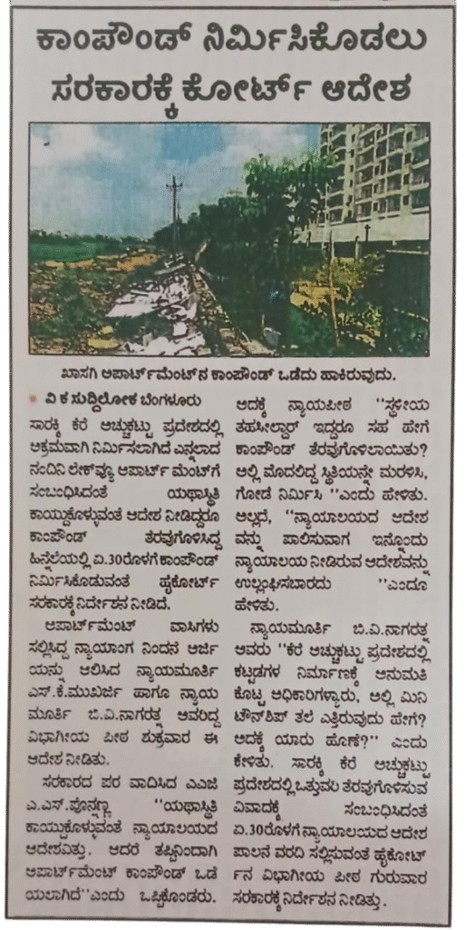 ಸಾರಕ್ಕಿ ಕೆರೆ ಅಚ್ಚುಕಟ್ಟು ಪ್ರದೇಶದಲ್ಲಿ ಅಕ್ರಮವಾಗಿ ನಿರ್ಮಿಸಲಾಗಿದೆ ಎನ್ನಲಾದ ನಂದಿನಿ ಲೇಕ್‌ ಆಪಾರ್ಟ್ ಮೆಂಟ್‌ ಗೆ ಸಂಬಂಧಿಸಿದಂತೆ ಯಥಾಸ್ಥಿತಿ ಕಾಯ್ದುಕೊಳ್ಳುವಂತೆ ಆದೇಶ ನೀಡಿದ್ದರೂ ಕಾಂಪೌಂಡ್ ತರವುಗೊಳಿಸಿದ್ದ ಹಿನ್ನೆಲೆಯಲ್ಲಿ ಏ.30ರೊಳಗೆ ಕಾಂಪೌಂಡ್ ನಿರ್ಮಿಸಿಕೊಡುವಂತೆ ಹೈಕೋರ್ಟ್ ಸರಕಾರಕ್ಕೆ ನಿರ್ದೇಶನ ನೀಡಿದೆ.