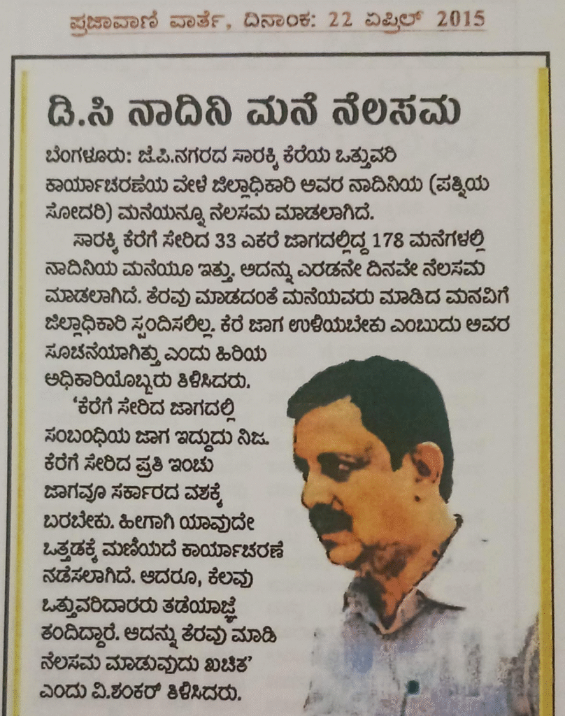 ಬೆಂಗಳೂರು: ಜೆ.ಪಿ.ನಗರದ ಸಾರಕ್ಕಿ ಕೆರೆಯ ಒತ್ತುವರಿ ಕಾರ್ಯಾಚರಣೆಯ ವೇಳೆ ಜಿಲ್ಲಾಧಿಕಾರಿ ಅವರ ನಾದಿನಿಯ (ಪತ್ನಿಯ ಸೋದರಿ) ಮನೆಯನ್ನೂ ನೆಲಸಮ ಮಾಡಲಾಗಿದೆ.