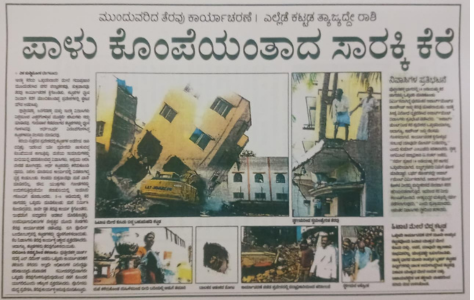 ಒತ್ತುವರಿ ಕಾರ್ಯಾಚರಣೆ ವೇಳೆ ಮೂರು ಅಂತಸ್ತಿನ ಕಟ್ಟಡವೊಂದು ಹಿಟಾಚಿ ಯಂತ್ರದ ಮೇಲೆ ಕುಸಿದು ಬಿತ್ತು. ಆದರೆ, ಯಾವುದೇ ಪ್ರಾಣಹಾನಿ ಸಂಭವಿಸಲಿಲ್ಲ, ಯಂತ್ರವಷ್ಟೇ ಜಖಂಗೊಂಡಿತು. ಸಾರಕ್ಕಿ ಭಾಗದ ಮೂರು ಅಂತಸ್ತಿನ ಬೃಹತ್ ಕಟ್ಟಡದ ಪಿಲ್ಲರ್‌ಗಳನ್ನು ಚಾಲಕ ಉರುಳಿಸಿದ್ದರಿಂದ ಕಟ್ಟಡವು ಏಕಾಏಕಿ ಯಂತ್ರದ ಮೇಲೆ ಉರುಳಿ ಬಿತ್ತು.
