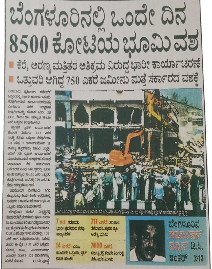 ಇದರೊಂದಿಗೆ ಬೆಂಗಳೂರು ನಗರ ಜಿಲ್ಲಾಡಳಿಶವು ಕೆಲವೇ ತಿಂಗಳ ಅವಧಿಯಲ್ಲಿ ಸುಮಾರು ? ನಾವಿರಎಕರೆ ಸರ್ಕಾರಿ ಭೂಮಿ ಒತ್ತುವರಿ ತೆರವುಗೊಳಿಸಿದಂತಾಗಿದೆ.