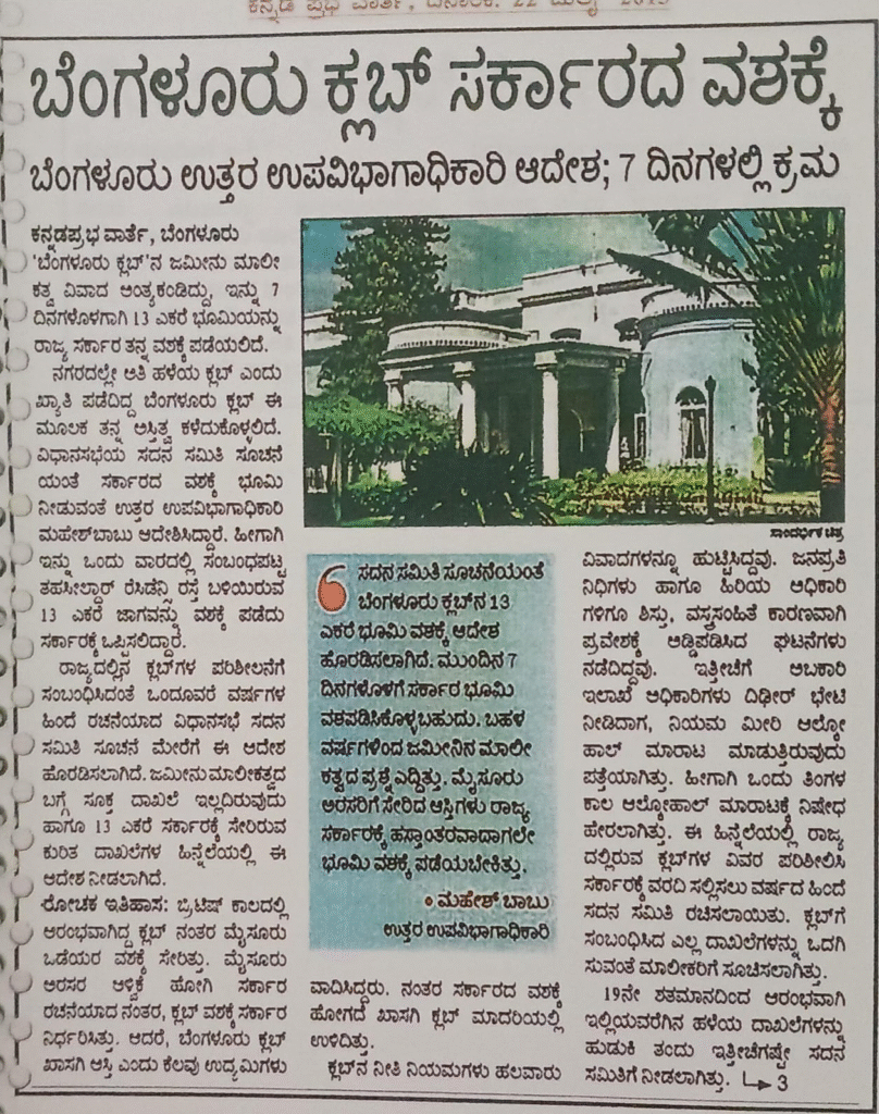 ನಗರದಲ್ಲೇ ಅತಿ ಹಳೆಯ ಕ್ಲಬ್ ಎಂದು ಖ್ಯಾತಿ ಪಡೆದಿದ್ದ ಬೆಂಗಳೂರು ಕ್ಲಬ್ ಈ ಮೂಲಕ ತನ್ನ ಅಸ್ತಿತ್ವ ಕಳೆದುಕೊಳ್ಳಲಿದೆ. ವಿಧಾನಸಭೆಯ ಸದನ ಸಮಿತಿ ಸೂಚನೆ. ಯಂತೆ ಸರ್ಕಾರದ ವಶಕ್ಕೆ ಭೂಮಿ ) ನೀಡುವಂತೆ ಉತ್ತರ ಉಪವಿಭಾಗಾಧಿಕಾರಿ ಮಹೇಶ್ ಬಾಬು ಆದೇಶಿಸಿದ್ದಾರೆ. ಹೀಗಾಗಿ ಇನ್ನು ಒಂದು ವಾರದಲ್ಲಿ ಸಂಬಂಧಪಟ್ಟ ತಹಸೀಲ್ದಾರ್ ರೆಸಿಡೆನ್ಸಿ ರಸ್ತೆ ಬಳಿಯಿರುವ 13 ಎಕರೆ ಜಾಗವನ್ನು ವಶಕ್ಕೆ ಪಡೆದು ಸರ್ಕಾರಕ್ಕೆ ಒಪ್ಪಿಸಲಿದ್ದಾರೆ.