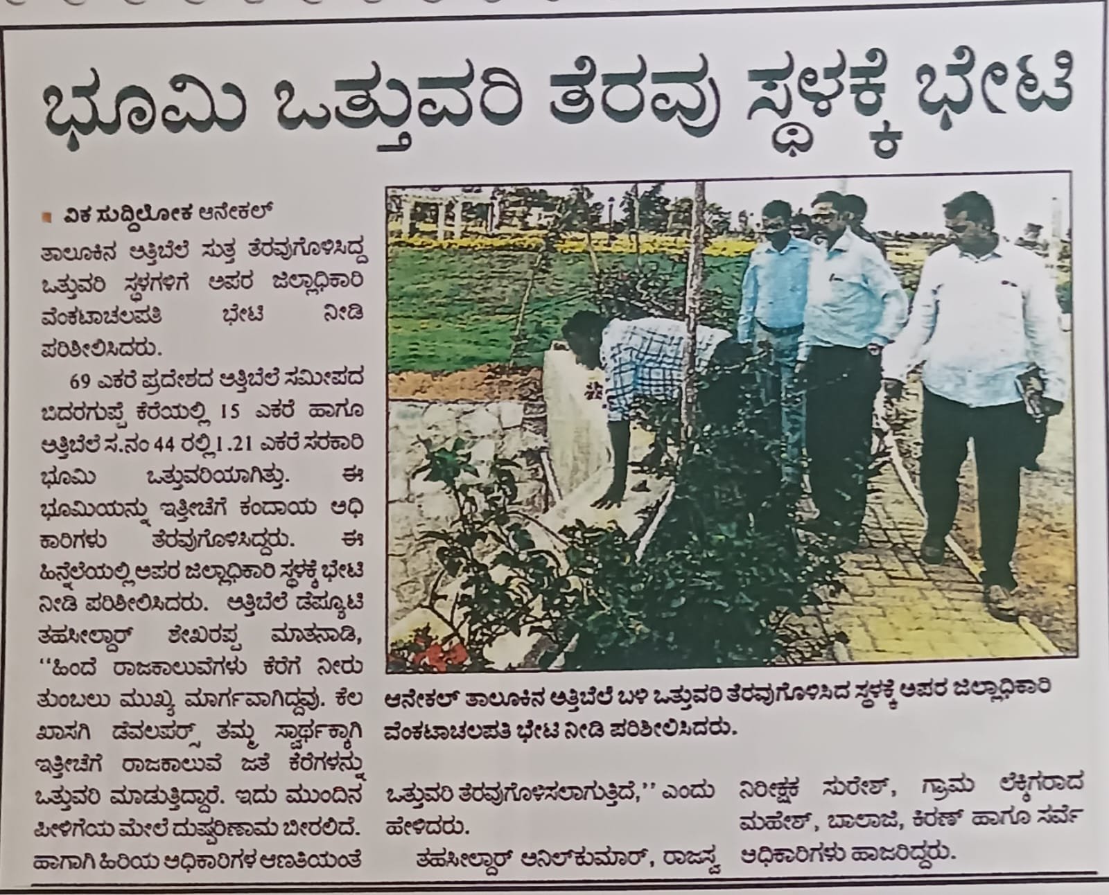 69 ಎಕರೆ ಪ್ರದೇಶದ ಅತ್ತಿಬೆಲೆ ಸಮೀಪದ ಬಿದರಗುಪ್ಪೆ ಕೆರೆಯಲ್ಲಿ 15 ಎಕರೆ ಹಾಗೂ ಅತ್ತಿಬೆಲೆ ಸ.ನಂ 44 ರಲ್ಲಿ 21 ಎಕರೆ ಸರಕಾರಿ భమి ಒತ್ತುವರಿಯಾಗಿತ್ತು. ಭೂಮಿಯನ್ನು ಇತ್ತೀಚೆಗೆ ಕಂದಾಯ ಅಧಿ ತೆರವುಗೊಳಿಸಿದ್ದರು. ಹಿನ್ನೆಲೆಯಲ್ಲಿ ಅಪರ ಜಿಲ್ಲಾಧಿಕಾರಿ ಸ್ಥಳಕ್ಕೆ ಭೇಟಿ ನೀಡಿ ಪರಿಶೀಲಿಸಿದರು. ಅತ್ತಿಬೆಲೆ ಡೆಪ್ಯೂಟಿ ತಹಸೀಲ್ದಾರ್ ಶೇಖರಪ್ಪ ಮಾತನಾಡಿ, ‘ಹಿಂದೆ ರಾಜಕಾಲುವೆಗಳು ಕೆರೆಗೆ ನೀರು ತುಂಬಲು ಮುಖ್ಯ ಮಾರ್ಗವಾಗಿದ್ದವು. ಕೆಲ ಖಾಸಗಿ ಡವಲಪರ್ ತಮ್ಮ ಸ್ವಾರ್ಥಕ್ಕಾಗಿ ಇತ್ತೀಚೆಗೆ ರಾಜಕಾಲುವೆ ಜತೆ ಕರೆಗಳನ್ನು ಒತ್ತುವರಿ ಮಾಡುತ್ತಿದ್ದಾರೆ. ಇದು ಮುಂದಿನ ಪೀಳಿಗೆಯ ಮೇಲೆ ದುಷ್ಪರಿಣಾಮ ಬೀರಲಿದೆ. తెనగాగి ఓరియ అధికారిగళ ఆణయం ಆನೇಕಲ್ ತಾಲೂಕಿನ ಅತ್ತಿಬೆಲೆ ಬಳಿ ಒತ್ತುವರಿ ತೆರವುಗೊಳಿಸಿದ ಸ್ಥಳಕ್ಕೆ ಅವರ ಜಿಲ್ಲಾಧಿಕಾರಿ ವೆಂಕಟಾಚಲಪತಿ ಭೇಟಿ ನೀಡಿ ಪರಿಶೀಲಿಸಿದರು. ಒತ್ತುವರಿ ತೆರವುಗೊಳಿಸಲಾಗುತ್ತಿದೆ,” ಎಂದು ಹೇಳಿದರು. ತಹಸೀಲ್ದಾರ್ ಅನಿಲ್ಕುಮಾರ್, ರಾಜಸ್ವನಿರೀಕ್ಷಕ ಸುರೇಶ್, ಗ್ರಾಮ ಲೆಕ್ಕಿಗರಾದ ಮಹೇಶ್, ಬಾಲಾಜಿ, ಕಿರಣ್ ಹಾಗೂ ಸರ್ವೆ ಅಧಿಕಾರಿಗಳು ಹಾಜರಿದ್ದರು.