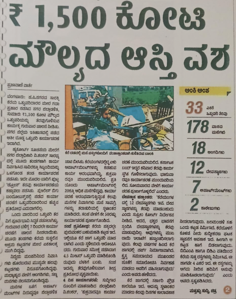 ಕರೆಯ ಒತ್ತುವರಿದಾರರ ಮೇಲೆ ಗದಾ ಪ್ರಹಾರ ನಡೆಸಿದ ನಗರ ಜಿಲ್ಲಾಡಳಿತ, ಸುಮಾರು ₹1,500 ಕೋಟಿ ಮೌಲ್ಯದ ಒತ್ತುವರಿಯನ್ನು ತೆರವುಗೊಳಿಸುವ ಕಾರ್ಯಕ್ಕೆ ಗುರುವಾರ ಚಾಲನೆ ನೀಡಿತು. ನಗರ ಜಿಲ್ಲೆಯ ಇತಿಹಾಸದಲ್ಲಿ ನಡೆದ ಆತೀ ದೊಡ್ಡ ಒತ್ತುವರಿ ಕಾರ್ಯಾಚರಣೆ ಇದಾಗಿದೆ.