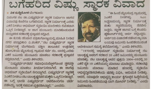 ದಿವಂಗತ ನಟ ಡಾ.ವಿಷ್ಣುವರ್ಧನ್ ಸ್ಮಾರಕ ನಿರ್ಮಾಣ ಜಾಗದ ವಿವಾದವು ಕೊನೆಗೂ ಬಗೆಹರಿದಿದೆ. ಸ್ಮಾರಕ ನಿರ್ಮಾಣಕ್ಕೆ ಎರಡು ಎಕರೆ ನೀಡಲು ಅಭಿಮಾನ್ ಸ್ಟುಡಿಯೊ ಮಾಲೀಕರು ಲಿಖಿತವಾಗಿ ಒಪ್ಪಿಗೆ ನೀಡಿದ್ದಾರೆ. ಆ ಜಾಗ ಮಂಜೂರು ಮಾಡಿಕೊಡುವಂತೆ ಜಿಲ್ಲಾಡಳಿತ ಸರಕಾರಕ್ಕೆ ಪ್ರಸ್ತಾವನೆ ಸಲ್ಲಿಸಿದೆ.